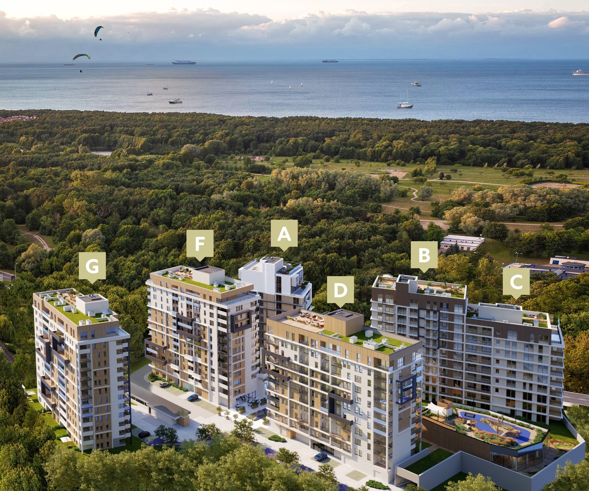 Położenie w pobliżu tak okazałej natury, pełnej zieleni drzew i piaszczystych plaż stało się inspiracją do zaprojektowania nowoczesnej bryły budynków, która będzie łączyć w sobie modernistyczny charakter z poszanowaniem naturalnych dóbr.